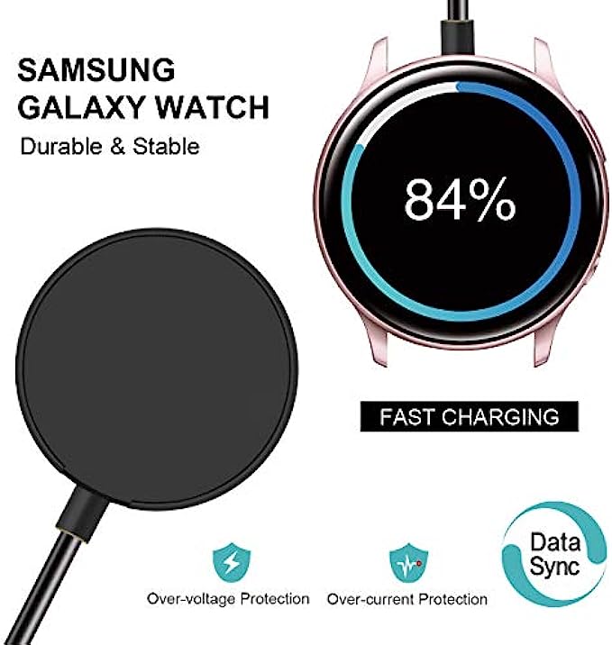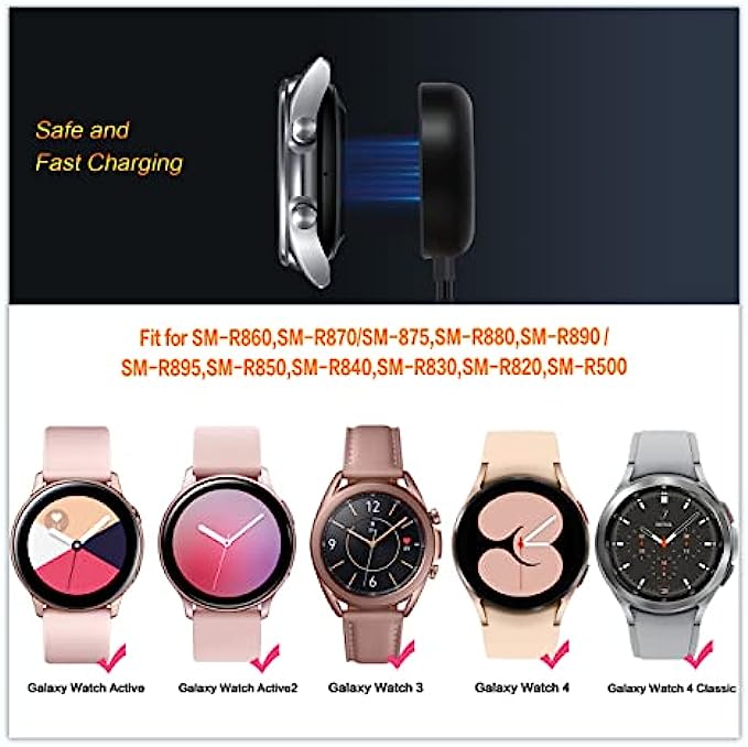 COMPATIBILITY:This Galaxy watch charger is specially designed for Samsung Galaxy Watch 4 40mm 44mm/4 Classic 42mm 46mm,Galaxy Watch 3 41mm/45mm(Not for gear S3),Active 2 40mm 44mm,Active 40mm.Includes SM-R860/R870/880/890, SM-R840/SM-R850/SM-R8450,SM-R820/R830/R8350,SM-R500.