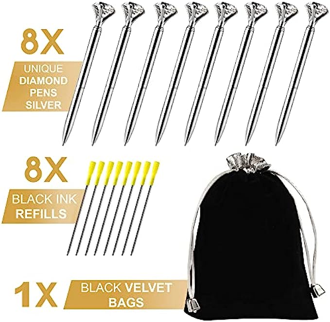 ? What’s in this awesome set? The luxury pack contains 8 Silvery pens topped with large diamonds and black ink inside, made of high-quality metal. Next to them, you get 8 extra 3.23-inch black ink refills, with NIB SEAL WAX to prevent any ink flow problems like spilling or drying out. To ADD MORE VALUE, these accessories come together in a delicate black velvet bag with silvery rope. With this premium set, any girl or women will feel amazing, just like a princess!