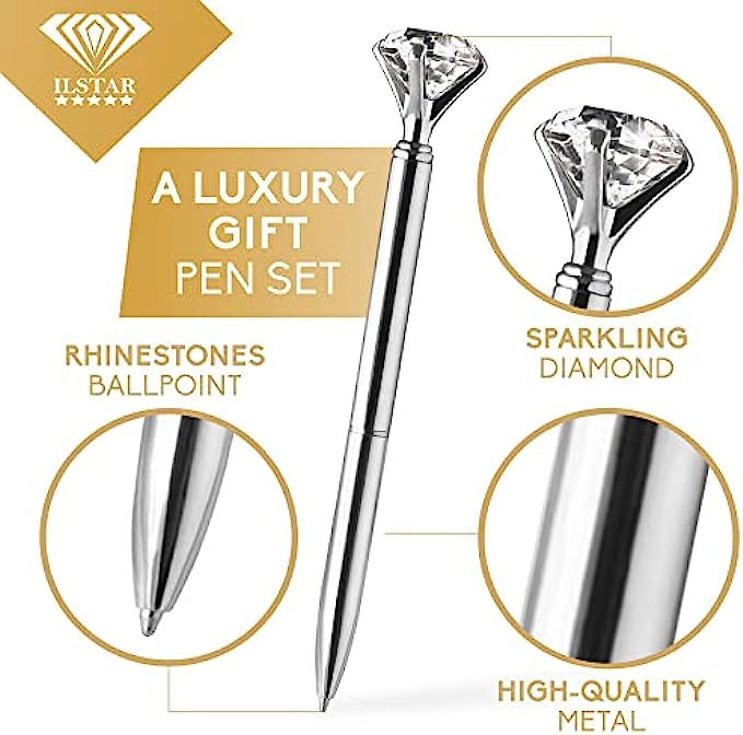 ? ILSTAR LIFETIME WARRANTY. Every silver pen for women, with decorative glass diamond on top, has been carefully checked and as a sign of appreciation for our customers we offer 100% SATISFACTION GUARANTEED. If you have any issue with the product or something goes wrong with your order, we offer TOTAL REFUND or we can change your set, it’s your choice. We are here to give you the best customer experience! So, click ADD TO CART button NOW and get these unique diamond pen sets!